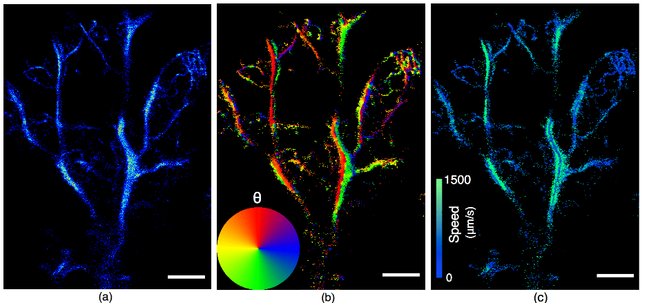 First in-vivo super-resolution images of a mouse hear. (a) Localisation Map. (b) Angle Map. (c) Velocity Map.